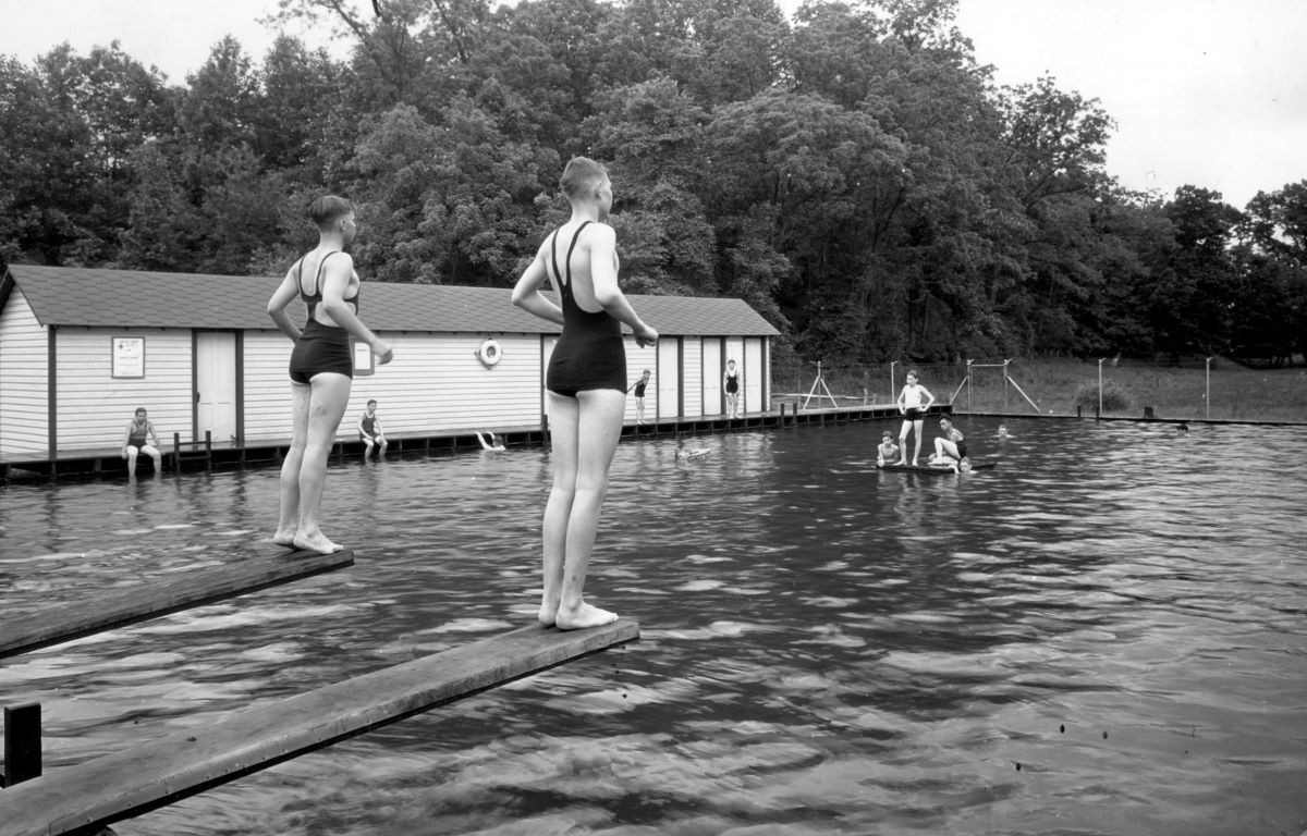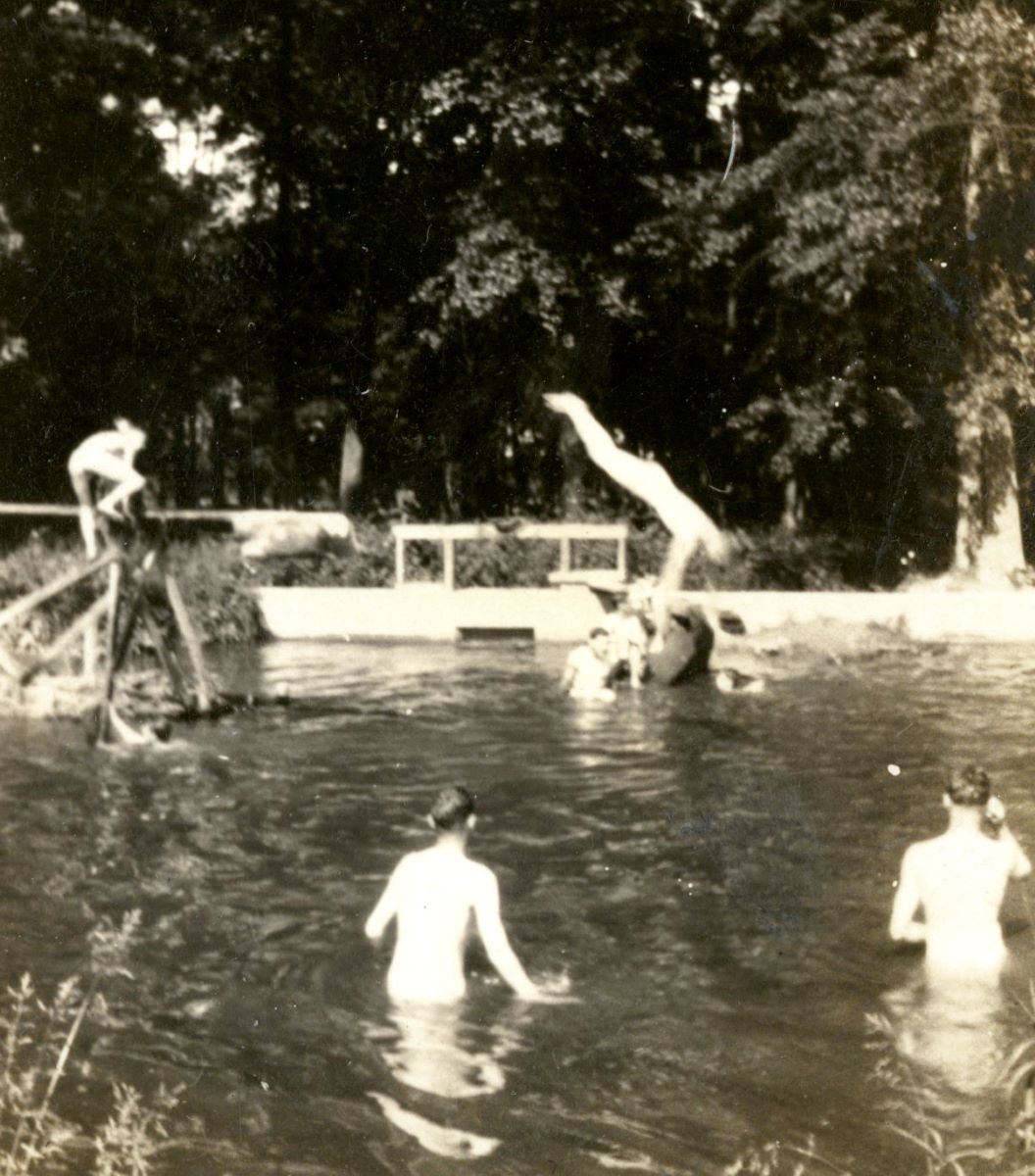 Former Headmaster Bob Lamborn ’35 recalled that the boys enjoyed swimming in the stream more than anything else. There were swimming holes all the way down the stream—Turtle Soup Bay above the dam from the mill race, the Horse Trough, and Three Stumps, which was the most popular. It was a deep spot in the stream near the bridge with a big tree overhanging the deep spot. The boys nailed boards to the tree so they could climb up and have high-diving contests. The train ran next to Three Stumps, and ladies in the trains could look out the windows and see the boys having a great time in the pool. The only problem was that the boys didn’t wear bathing suits. The ladies complained to the conductor who told management, who then reported it to the school. During the Depression, homeless people who rode the rails often camped at Three Stumps because they could jump off the cars that stopped in the nearby station, clean up, sit in the shade, and cook.
