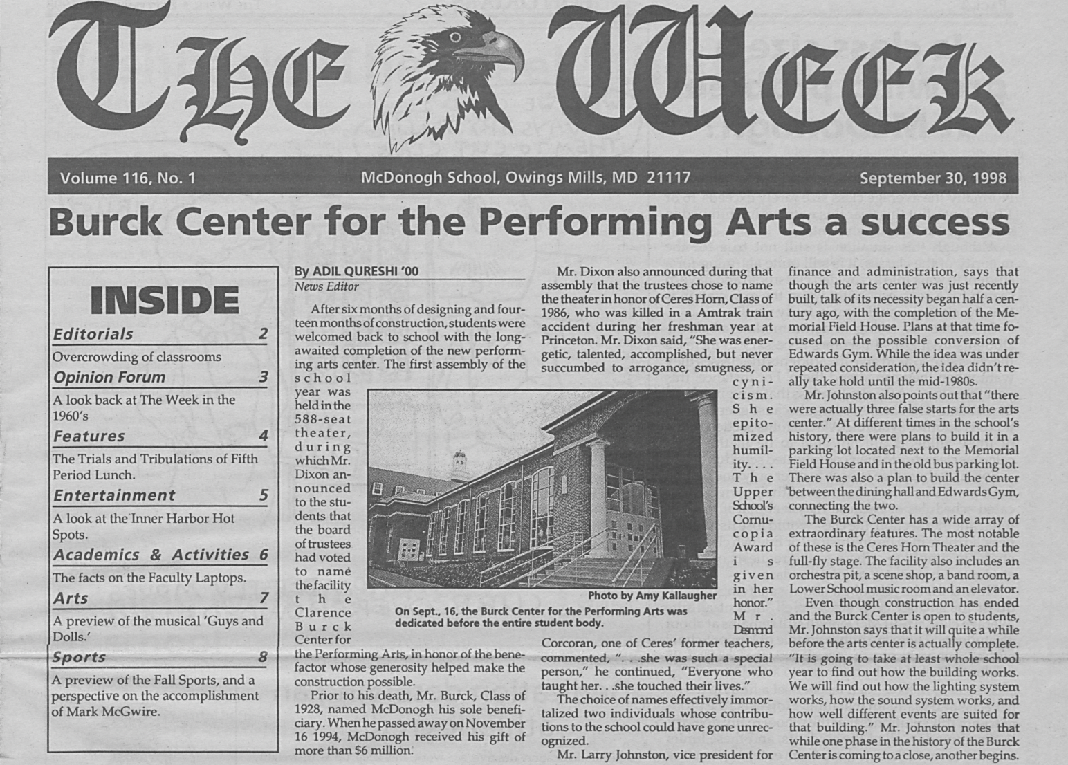 The following story was reported in the September 30, 1998 issue of The Week by Adil Qureshi ’00. Burck Center for the Performing Arts a Success After six months of…