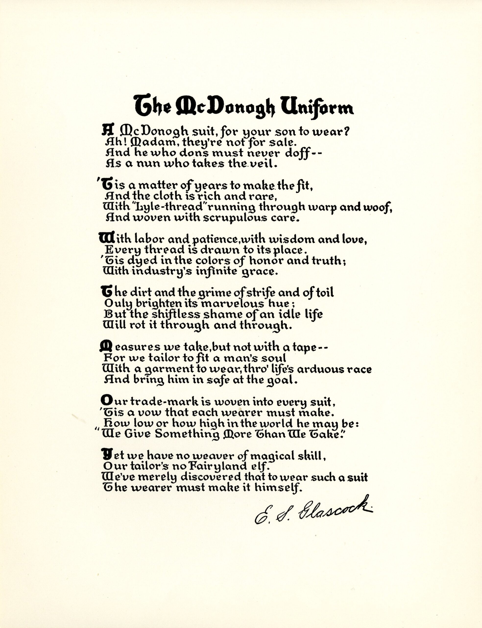 In 1916, Eustace Glascock (see Story No. 17) submitted a poem, The McDonogh Uniform, to the School newspaper, The Week. In doing so he said, “I see you’ve been giving…