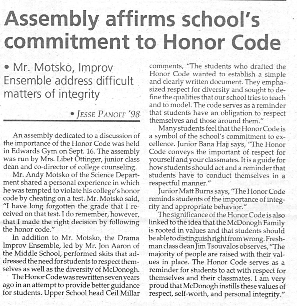 More than 30 years since it was defined, McDonogh’s Honor Code has withstood the test of time. At the beginning of each school year, Upper and Middle School students are reintroduced to the importance of the Honor Code, thus setting a tone and expectation for the months ahead.