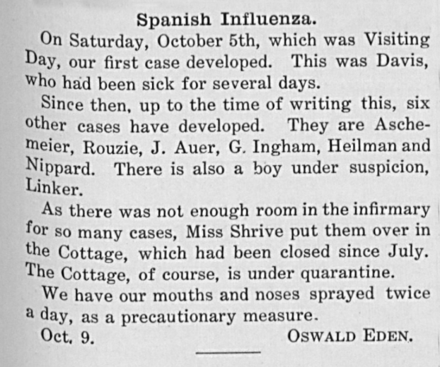 According to an article in The Week, in light of the illness, Headmaster Morgan Bowman “thought it best for the people to stay in the open as much as possible” so, to the disappointment of the students there was no dancing or any amusement for the visitors. By October 9, six more cases had developed, the infirmary was filled to capacity, and the School was closed by order of the health authorities. And as one reporter for The Week noted, “We have our mouths and noses sprayed twice a day as a precautionary measure.”