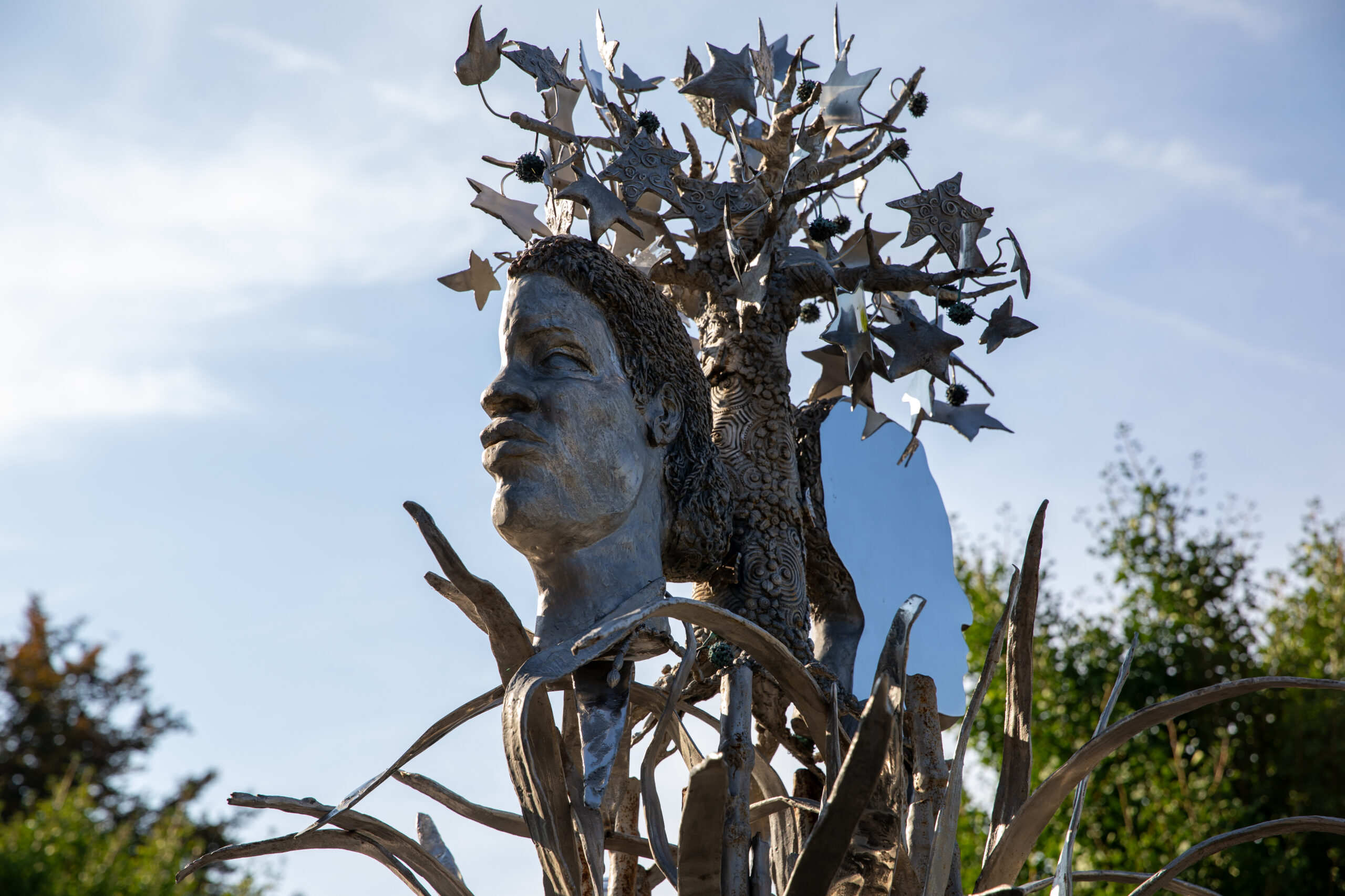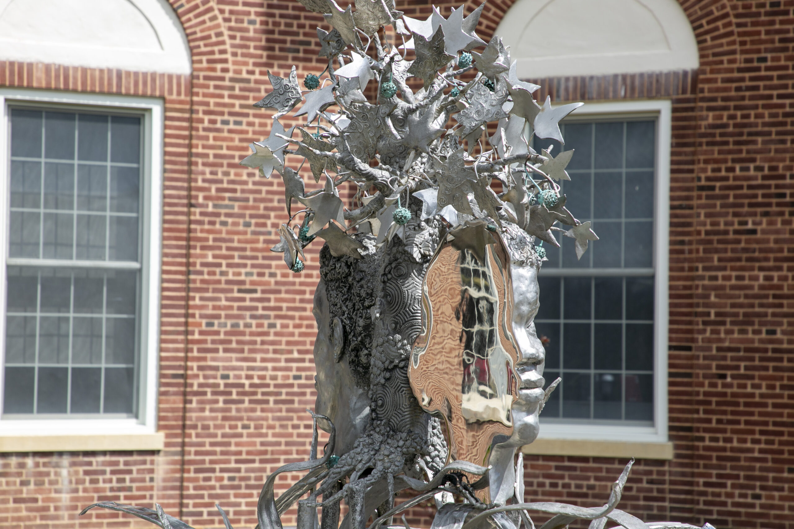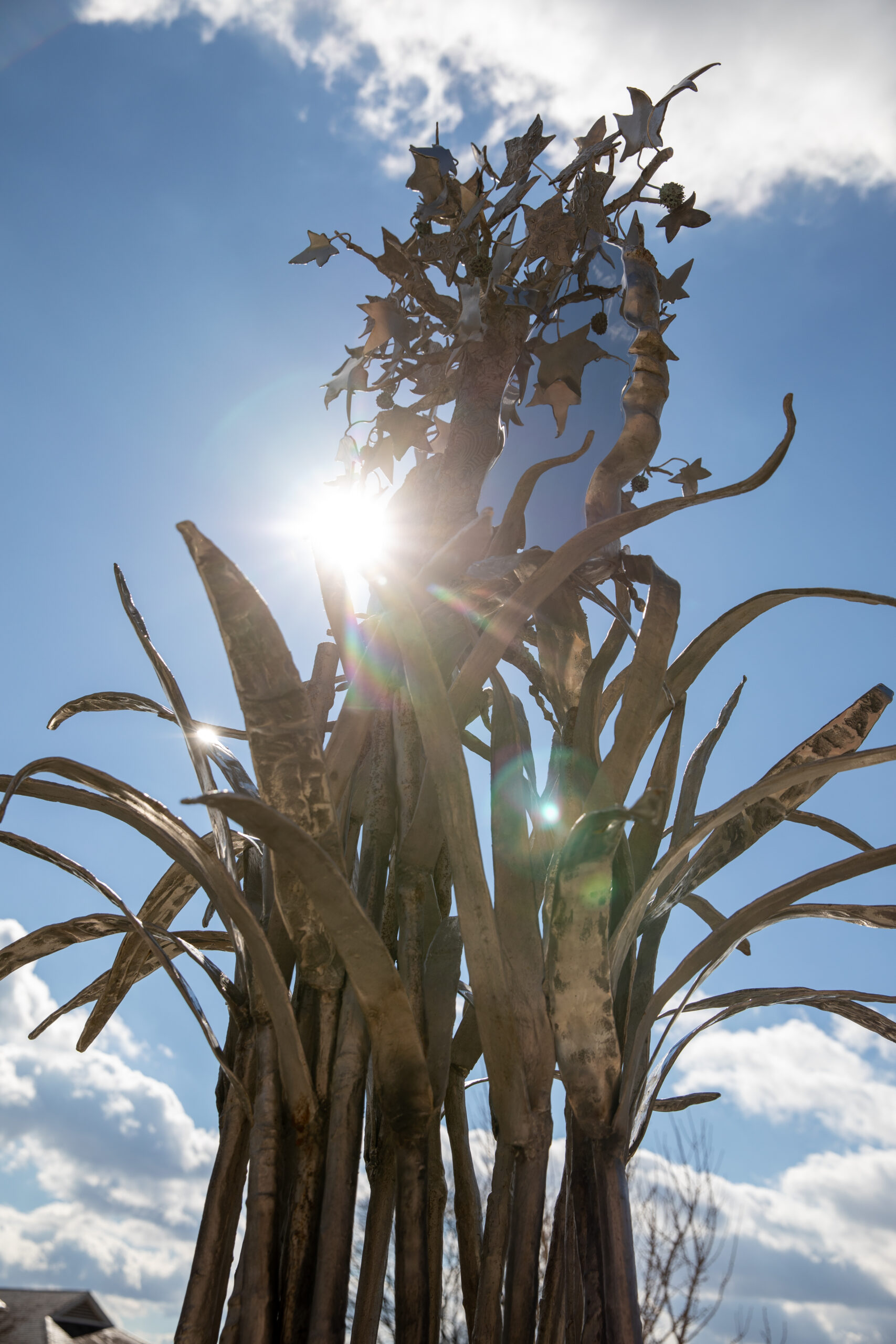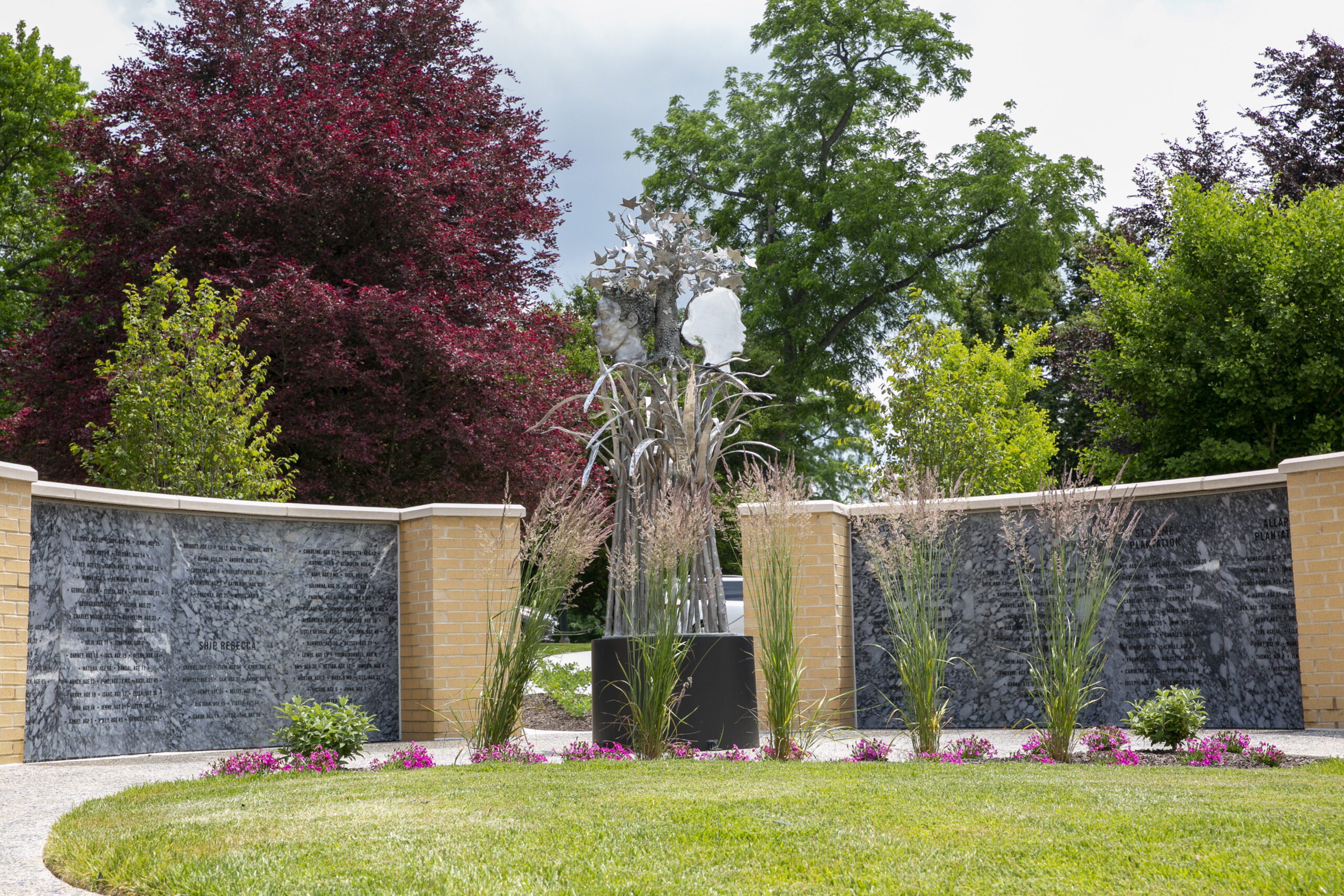 Positioned in the center of the memorial garden is a multi-layered sculpture called Ascend. It is approximately 14 feet tall and was forged out of both polished and matte steel. It is not only a singular element in the space but something that draws on the environment by reflecting the colors in the garden and landscaping.