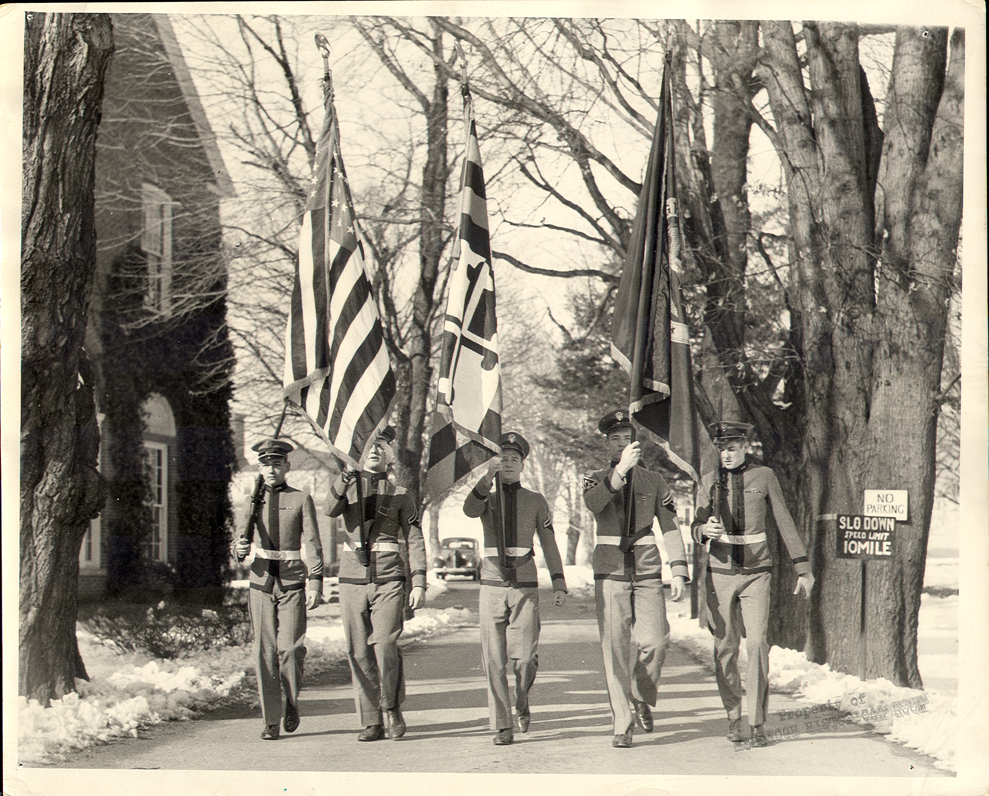 During the military era, Monday afternoons were set aside for preparation for the Competitive Drill — the culmination of the year’s military effort. The year began with an officer training school in September. From fall to spring, cadets were taught the fundamentals of close-order drill, the manual Springfield of arms, and military discipline and courtesy. During the drill, the older cadets carried rifles issued by the U. S. Government. When not in use, the rifles were kept in the dormitories, and each cadet was responsible for the care and cleaning of his piece.