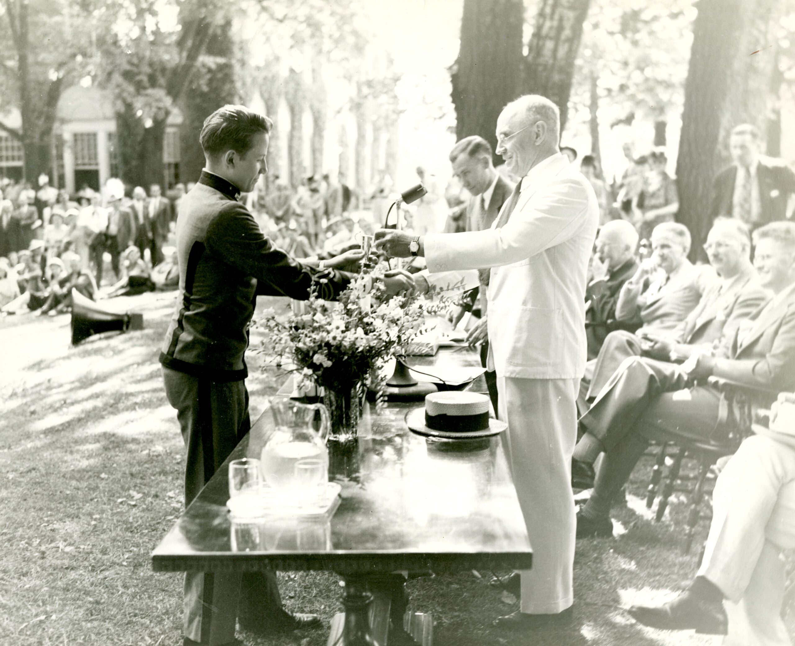 For many years, Commencement Day also included military drills, and alumni were encouraged to attend. The 54th Annual Commencement of the School in 1927, the largest to date, also included a riding exhibition and horse show as well as “exhibitions of the work in the Manual Training Shops and in Drawing, with a showing as to what may be accomplished in the new automobile shop which will be instituted next fall.” The Week reported, “The boys spent the morning getting the grounds, buildings, and themselves prepared to receive visitors, who will arrive early in the afternoon.”