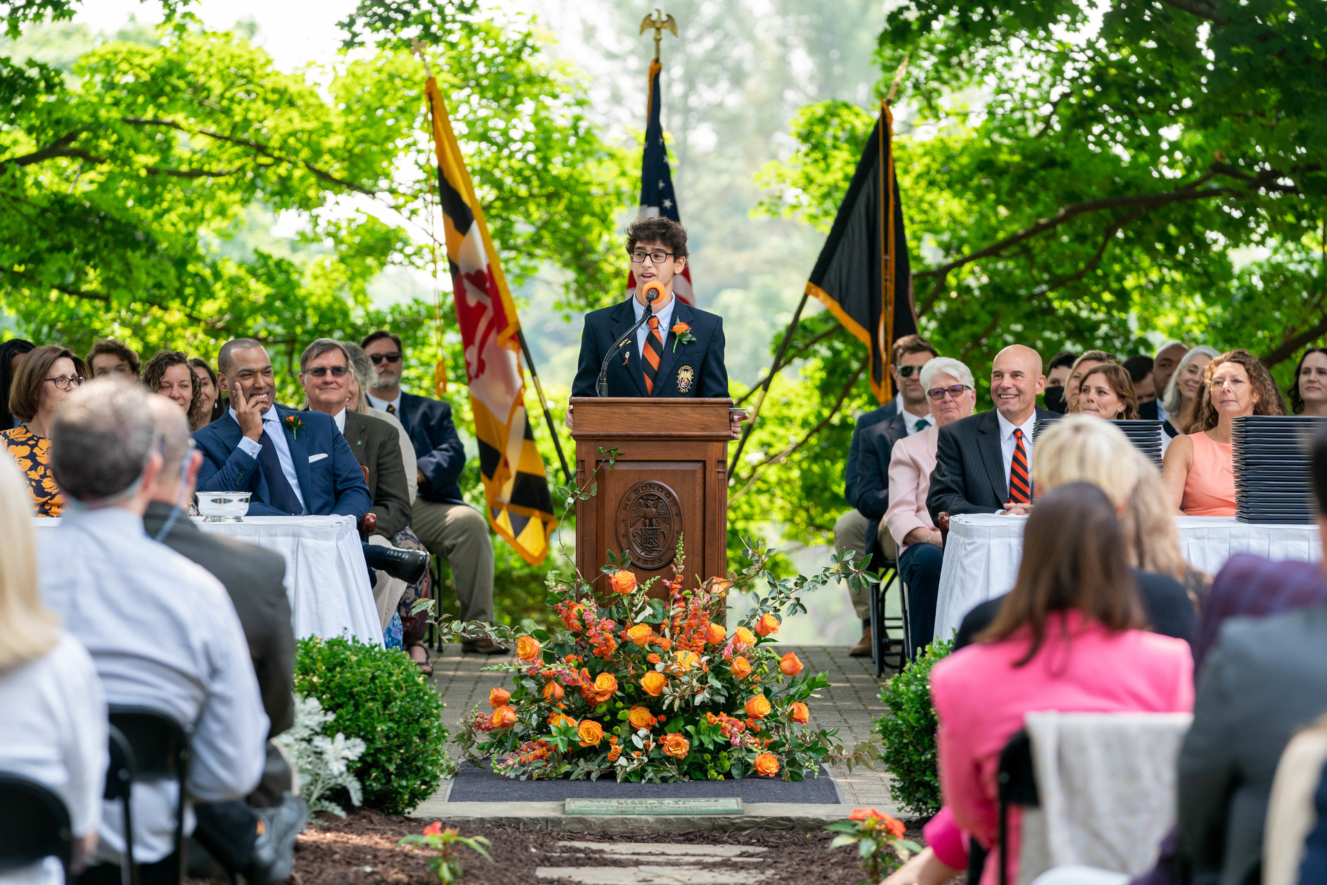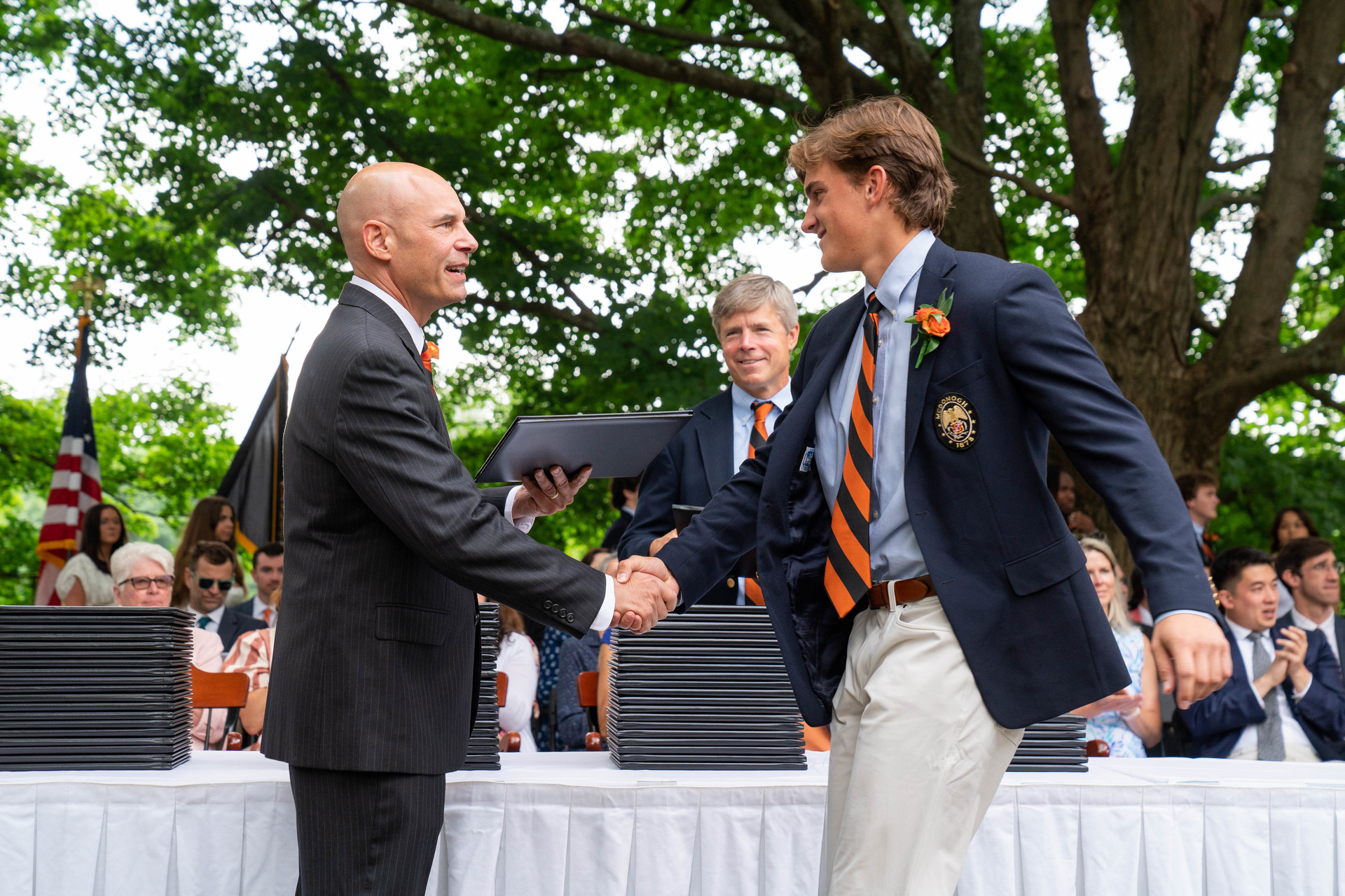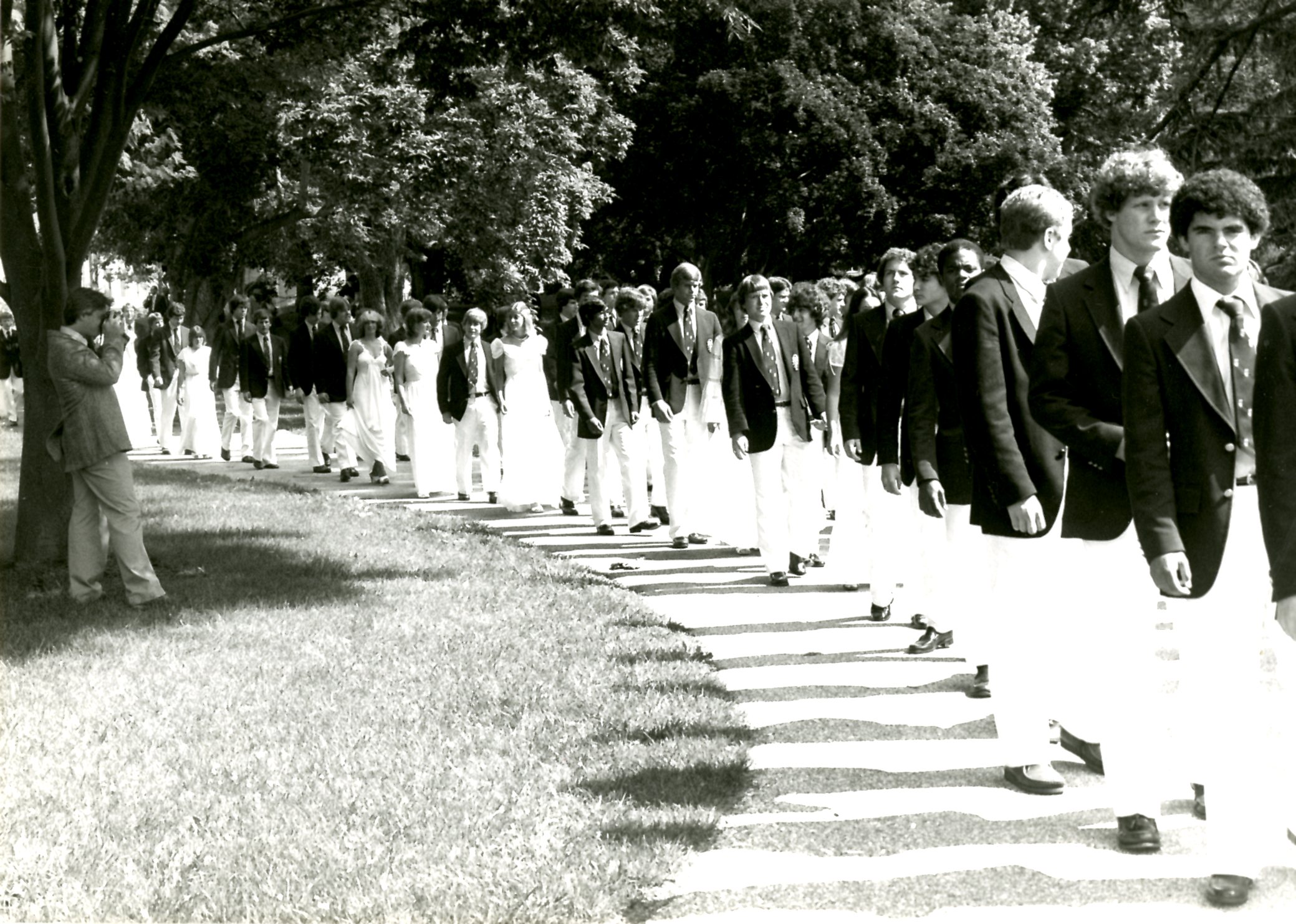 Today, elements of past Commencement ceremonies can be seen in the celebration that traditionally takes place on a Friday in early June. After the Baccalaureate, the graduates gather in Tagart Chapel and then process through the doors and down the hill to Childs Memorial Terrace to the applause of faculty and staff who have guided them on their McDonogh journey. After senior awards are presented, a member of the graduating class, chosen by their peers, gives the Commencement address and the Head of School offers final words and advice. Once the diplomas have been conferred, along with official Alumni Association membership cards, the Dedication Hymn (see story No. 1) is sung by the graduates and alumni in attendance.