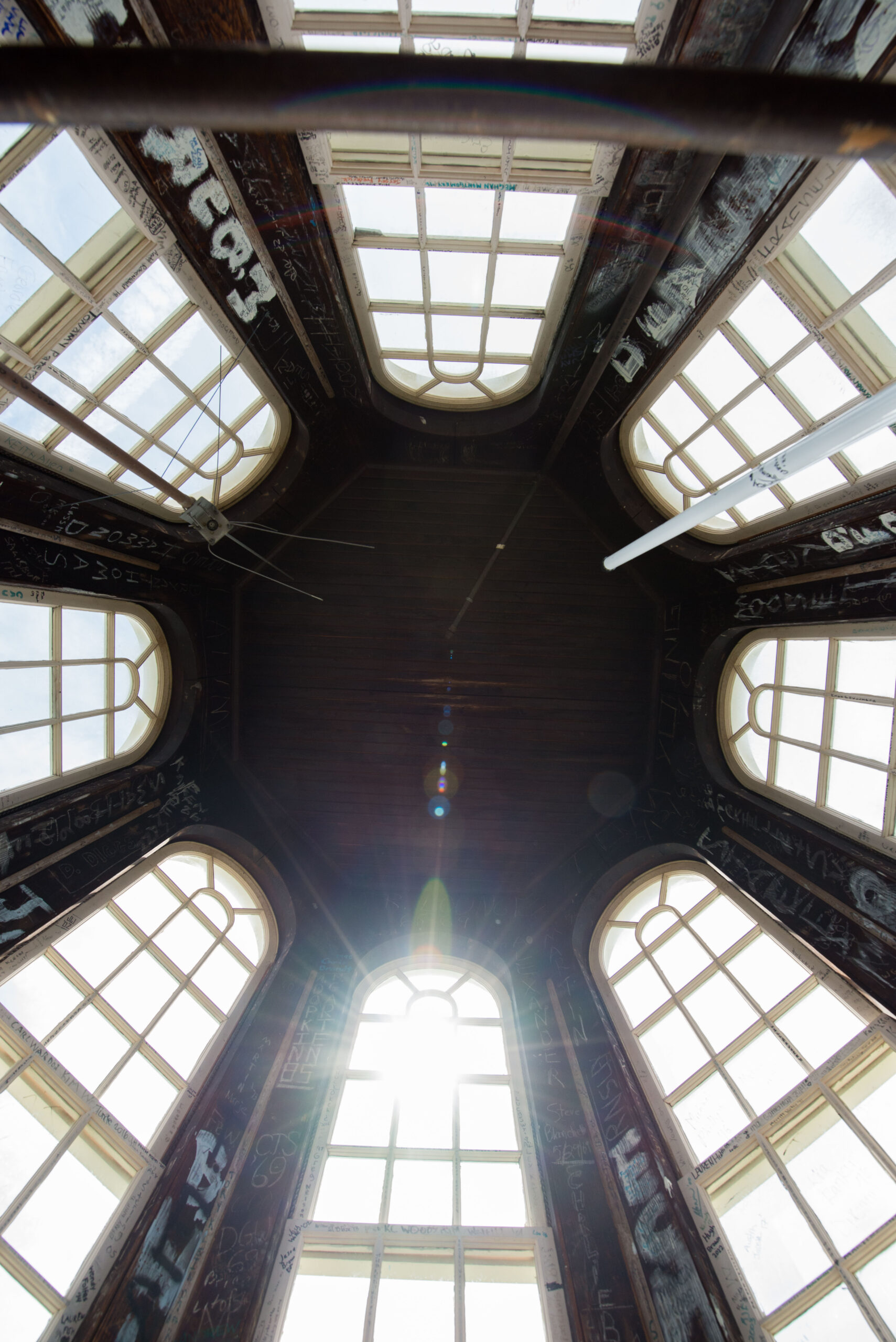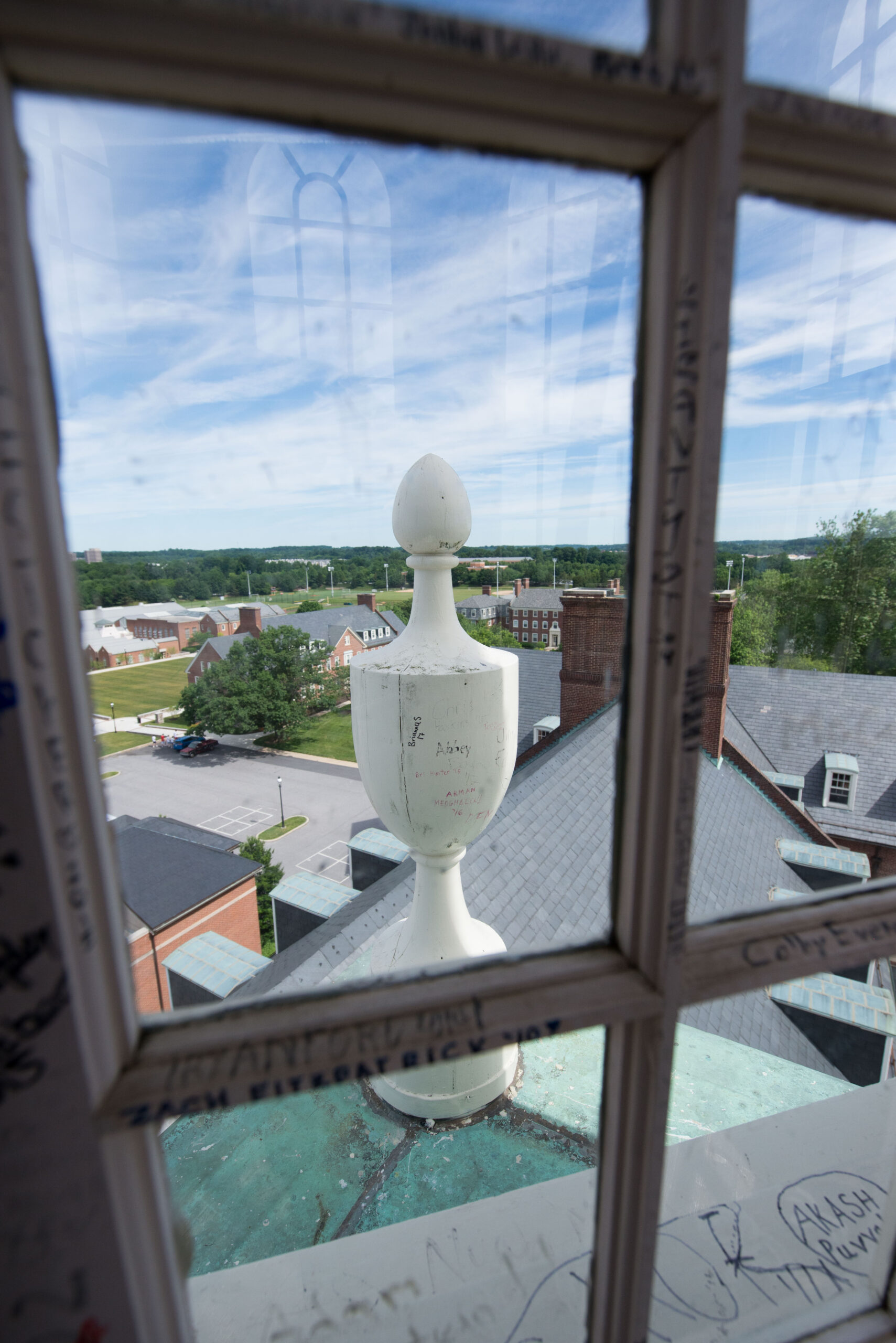 The Allan Building clock tower is officially off-limits all of the time…except under special circumstances. Over the years, the cupola, accessed by a circular metal staircase, has been visited by countless students — at the pinnacle of their senior year — who have been granted the privilege of entering the minute space with sweeping views. The expedition to the peak of Allan Building is the final opportunity for the soon-to-be graduates to make their mark — literally. There, with Sharpie markers in hand, they punctuate the end of their McDonogh career by signing their names (with permission) on the walls, floors, window frames, and anywhere they can find a space. The annual trek truly marks the passage of time.